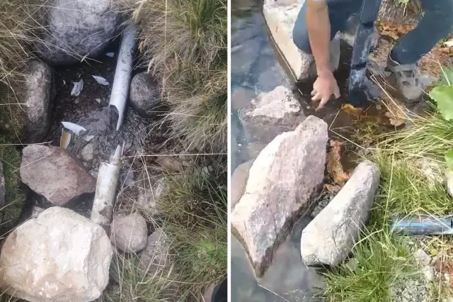 Bolu’nun Kıbrıscık ilçesinde içme suyu hattına bir hafta içinde ikinci kez zarar verildi. Belediye ekipleri tarafından onarım çalışması başlatılırken, su hattındaki tahribat kameraya yansıdı.