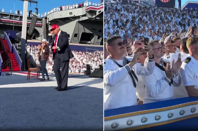 Başkan Donald J. Trump, Pazar günü beyaz üniformalı yaklaşık 10.000 denizciden oluşan kalabalığa, “Kabul edelim, bu bir miting” dedi. Olay, iki devasa Donanma gemisi, bir uçak gemisi ve bir amfibi hücum gemisi arasında bulunan bir iskelede gerçekleşti.