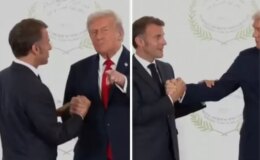 Zirveye damga vuracak görüntüler! Trump ile Macron bilek güreşine tutuştu