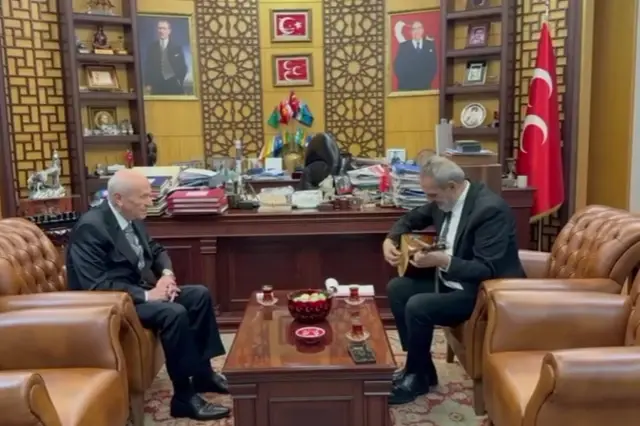 Ben Alevi Bektaşi kökenli bir sanatçı olarak zatıalilerine teşekkür etmek için bu ziyarette bulundum.” ifadelerini kullandı. Ziyarette Bahçeli’ye, daha önce hazırladığı bir Alevi deyişini seslendiren Yavuz Bingöl, çaldığı bağlamayı da genel başkana hediye etti.