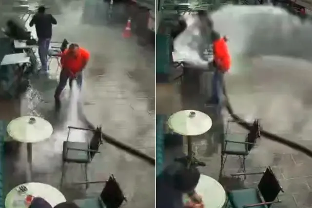 İstanbul Bayrampaşa’da bir kafe işletmecisi, iş yerinin önünü tazyikli suyla temizlemek isterken hortumun kontrolünü kaybetti. Şov yapmaya çalışırken müşterileri ıslatan esnafın yaşadığı talihsiz anlar güvenlik kamerasına yansıdı.