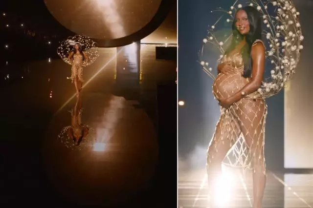 Klasik Victoria’s Secret tarzında altın renkli melek kanatları ve ışık detaylı kostümüyle yürüyen Tookes, salondaki tüm dikkatleri üzerine çekmişti. Ağ dokulu, vücudu saran tek parça kıyafetiyle zarafetini gözler önüne sermiş, podyumda kısa bir an durup karnını elleriyle tutarak duygusal bir poz vermişti.