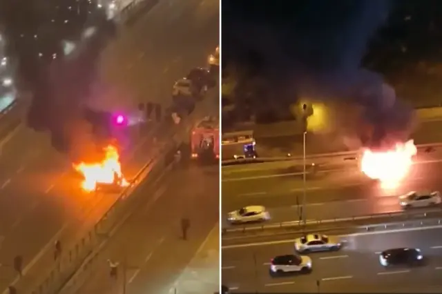 Çevredekilerin ihbarı üzerine olay yerine itfaiye, sağlık ve polis ekipleri sevk edildi. Yangın, itfaiye ekipleri tarafından söndürülürken, otomobil demir yığınına döndü. O anlar diğer sürücülerin cep telefonu ile kaydedildi.