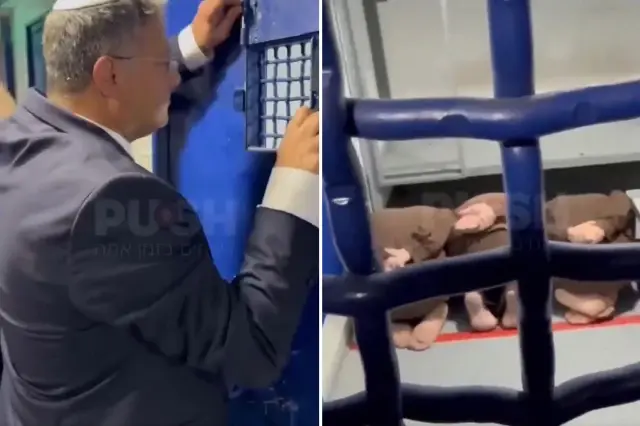 Ben-Gvir, İsrail’in güneyinde yer alan Ketziot Hapishanesi’nde Filistinli esirlerin tutulduğu küçük hücrenin önünde kaydettiği videoyu sosyal medyada paylaştı. İçinde 3 Filistinli esirin yerde dizleri üzerinde bekletildikleri küçük hücrenin önünde duran Ben-Gvir, “Filistinli esirler hak ettikleri şekilde yerlerde oturtuluyor” dedi.