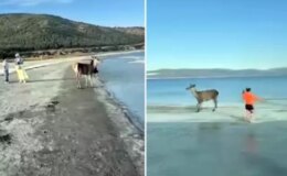 Nesli tehlikedeki kızıl geyik plajda görüntülendi