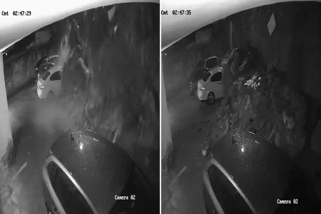 Maltepe’de sağanak yağışın ardından bir binanın istinat duvarı, gece saatlerinde büyük bir gürültüyle park halindeki 3 otomobilin üzerine düştü. Çökme anı güvenlik kamerasına yansırken şans eseri yaralanan olmadı.