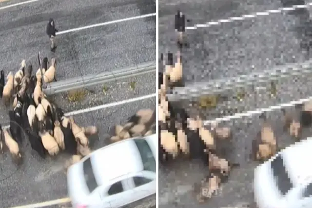 KGYS sisteminden alınan kaza görüntülerinde, anayolda seyir halindeki bir aracın yola aniden çıkan koyun sürüsüne daldığı görüldü. Feci anlar, kameralara da yansıdı.