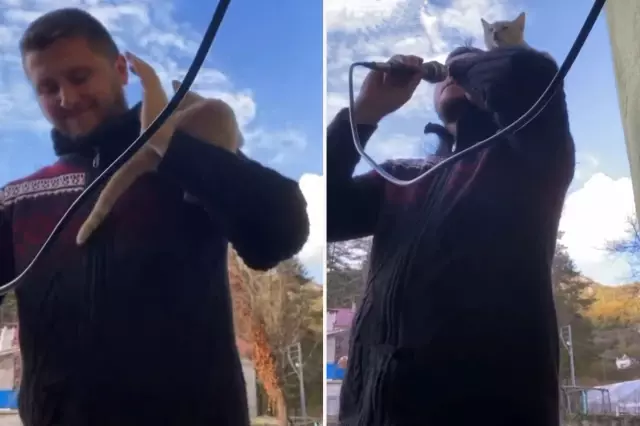 Ovacık köyü Doğruca Mahalle Camisi'nde imamlık yapan Furkan Abay, ikindi ezanını okumaya başladığı anda bir kedi üstüne tırmanmaya başladı.