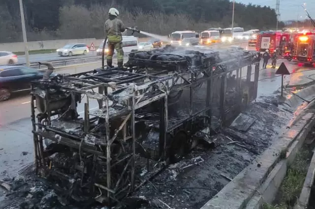 Öte yandan otobüsün olay yerinden kaldırılması için çekici bekleniyor. Yangın nedeniyle Kemerburgaz Yolu'nda her iki istikamette de trafik yoğunluğu oluştu.