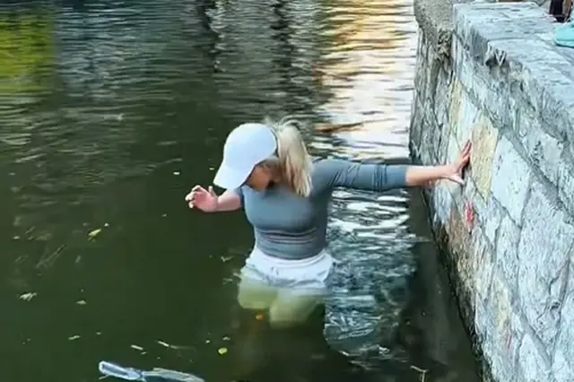 Telefonunu nehre düşüren kadın hiç düşünmeden nehre girdi ve ayakları ile telefonun aramaya başladı. O sırada orada bulunan turistlerin şaşkın bakışları da kameralara yansıdı.