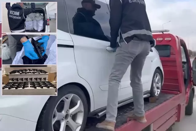 Eskişehir'de polisin uygulama noktasında durdurduğu çekici üzerinde, arızalı görüntüsü verilmiş hafif ticari araçta çok sayıda silah parçası ele geçirildi, 2 kişi gözaltına alındı.