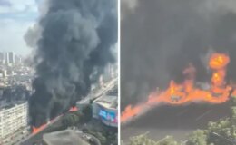 Yanıcı madde taşıyan kamyon yandı, alevler metrelerce yüksekliğe ulaştı