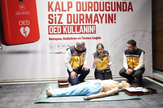 Bakan Memişoğlu, hazırladıkları yönetmeliğe dikkat çekerek, "2026-2028 yıllarını kapsayan stratejik planımız çerçevesinde; havaalanları, AVM'ler, istasyonlar gibi insan yoğunluğunun fazla olduğu alanlarda bu cihazların bulundurulmasını kademeli olarak artıracağız. Nasıl ki ambulanslarımız trafikte milletimizle güçlü bir iş birliği içinde hareket ediyorsa, bu uygulamayla acil sağlık zincirinin ilk halkasını güçlendiriyor, her bir vatandaşımıza 'kalp durduğunda siz durmayın' diyoruz. Bu aynı zamanda bir toplumsal dayanışma çağrısıdır. Amacımız; vatandaşlarımızın ilk yardım bilincini güçlendirerek, her kişiyi potansiyel bir hayat kurtarıcı haline getirmektir. Herkesi hayat kurtarmaya hazır, sağlık ordumuzun gönüllü bir üyesi olmaya davet ediyorum. 'İlk yardım hayat kurtarır' anlayışını, artık sadece bir motto değil, toplumumuzun ortak bir refleksi haline getirmeliyiz" ifadelerini kullandı.