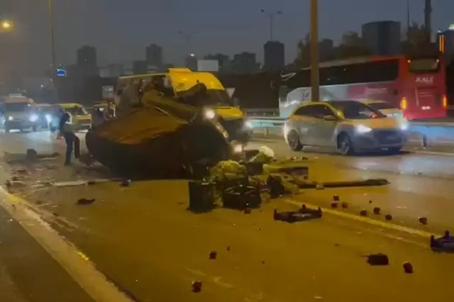 Bağcılar, TEM Otoyolu Mahmutbey gişeler istikametinde hafriyat kamyonu, kamyonet ve servis minibüsünün çarpışması sonucu meydana geldi.