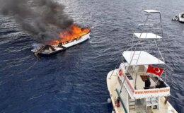 Kalkan açıklarında lüks teknenin alev alev yandığı anlar dronla görüntülendi