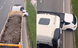 Hafriyat kamyonu, önüne kattığı otomobili 100 metre sürükledi