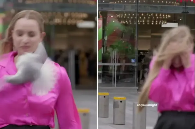 32 yaşındaki Jessica Tyson, Auckland'ın iş merkezinde kameraya konuşurken bir martı aniden üzerine doğru uçup yüzüne çarptı. Çarpmanın etkisiyle neye uğradığını şaşıran muhabir, bir anda "Lanet olsun!" diye bağırarak ellerini yüzüne götürdü.