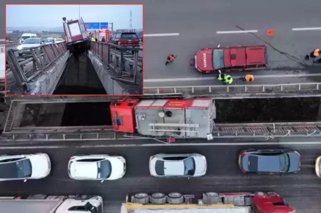 Kırıkkale'de bir itfaiye aracı, lastiğinin patlaması sonucu kontrolden çıkarak iki köprü arasında asılı kaldı. Araç, köprünün hemen altından geçen Doğu Ekspres tren hattına ait yüksek gerilim tellerine metreler kala durdu. Kazada 3 personel yaralandı, muhtemel bir facia önlendi.