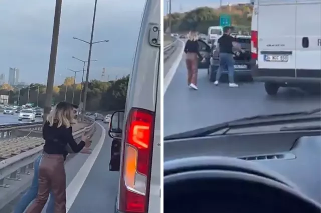 Olay, İstanbul'un yoğun trafiği sırasında meydana geldi. Sosyal medyada yer alan görüntülere göre, plakası henüz netleşmeyen bir otomobilde bulunan bir kadın ve bir erkek, trafikte tartıştıkları başka bir sürücünün aracının önünükesti.