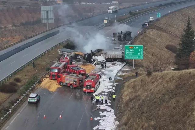 Gaziantep'te TAG Otoyolu'nda 3 tırın karıştığı zincirleme trafik kazası meydana geldi. Kazanın ardından tırlarda yangın çıktı. Kaza nedeniyle yol trafiğe kapatılırken ekiplerin çalışmasıyla alevler söndürüldü.