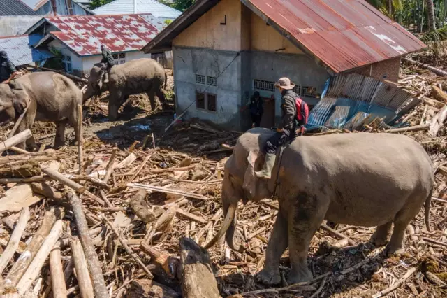 Endonezya'nın Açe bölgesinde sel felaketinin ardından başlatılan enkaz temizleme çalışmalarında filler görev alıyor.
