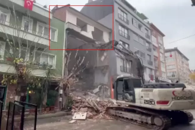 Bursa'da iş makinesiyle zeminden başlanan 4 katlı binanın son katı, kolon ve duvarların üzerinde ayakta kalınca iki apartman arasında ilginç bir görüntü ortaya çıktı. Son kat da iş makinesinin darbesiyle yerle bir olurken, o anlar kameraya yansıdı.