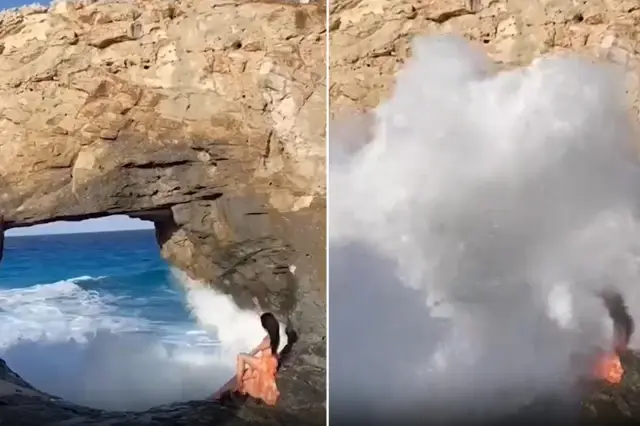 Mısır'ın turistik kıyılarında yaşanan tehlikeli anlar saniye saniye kaydedildi. Deniz manzarası eşliğinde fotoğraf çektirmek isteyen bir kadın, kayalık bir uçurumun üzerinde oturduğu sırada gelen dev dalganın çarpmasıyla dengesini kaybederek savruldu.
