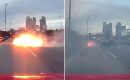Makas atan sürücü bariyerlere çarptı, motoru alev alıp yola fırladı