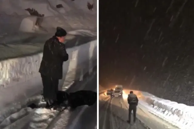 Hakkari'nin Yüksekova ilçesinde etkili olan yoğun kar yağışı ve tipi hayatı olumsuz etkilerken, karayolunda mahsur kalan bir vatandaşın fırtınaya rağmen namaz kıldığı anlar cep telefonu kameralarına yansıdı.