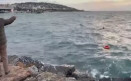 Silivri’de bir vatandaş soğuk hava ve lodosa aldırış etmeden denize girdi