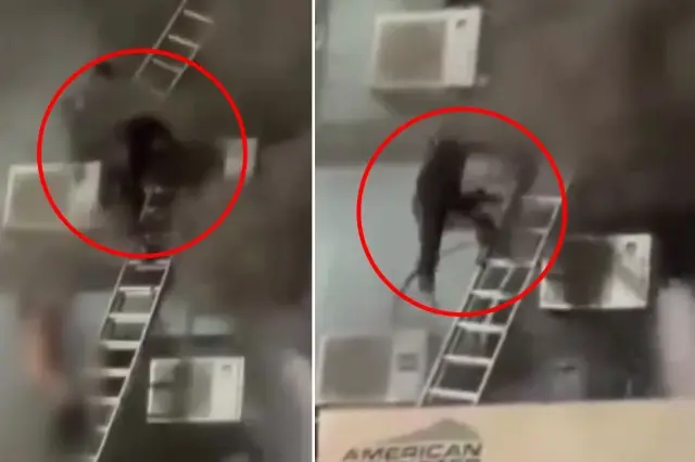 Yangından kaçmaya çalışan 2 kişi, binanın cephesindeki klimaların motorlarına kurulan merdivenlerden inerken dengelerini kaybederek metrelerce yüksekten yere çakıldı. Dehşet veren o anlar, kameralara yansıdı.
