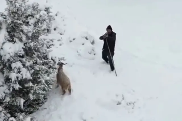 Ankara’nın Nallıhan ilçesinde karla kaplı ormanlık alanda sürüsünü otlatan bir çoban, havada kendisine yaklaşan drona tüfeğini doğrulttu Cihazın çıkardığı sesten ve ani manevrasından tedirgin olan çobanın refleksi, kameraya anbean yansıdı.