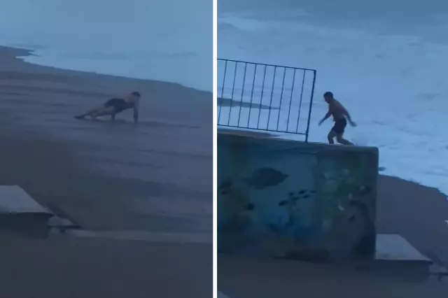Antalya'da şiddetli rüzgar nedeniyle oluşan dev dalgalar sahili döverken, bir vatandaş dalgaların arasında şınav çekerek sabah sporu yaptı. Ancak bir süre sonra üzerine doğru gelen 2 metrelik dalgayı görünce hızla sahilden uzaklaştı. O anlar, başka bir vatandaşın cep telefonu kamerasına yansıdı.
