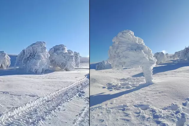 Dondurucu soğukların etkisiyle ağaç dalları buzla kaplanırken, yaylada oluşan manzara dikkat çekti. Beyaz örtüyle kaplanan Susuz Yaylası'nda donan ağaçlar, kartpostallık görüntüler oluşturdu.