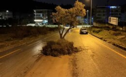 Sel suları kökünden söktüğü zeytin ağacını yola sürükledi