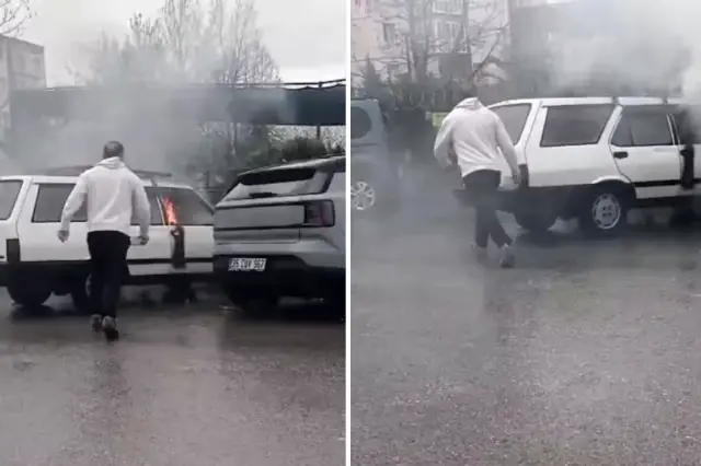İzmir'in Torbalı ilçesinde park halindeki bir otomobilde çıkan yangın, çevredekilerin hızlı müdahalesi sayesinde büyümeden kontrol altına alındı. Bir vatandaşın su birikintisinden su taşıyarak yangına müdahale etmesi ise dikkat çekti.