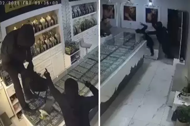 Öte yandan olay anına ilişkin güvenlik kamerası görüntüleri ortaya çıktı. Görüntülerde kar maskeli 2 şüphelinin ellerinde tabancalarla koşarak içeri girdikleri, çalışanın kafasına tabancanın kabzasıyla birkaç kez vurdukları, ardından vitrindeki altınları yanlarında getirdikleri çantaya koyarak kaçtıkları görüldü.