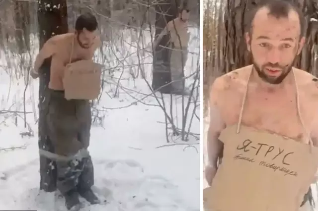 Görüntülerde, savaşmayı reddettikleri veya görev yerlerini terk ettikleri iddia edilen askerlerin dondurucu soğukta soyularak ağaçlara bağlandığı görülüyor.