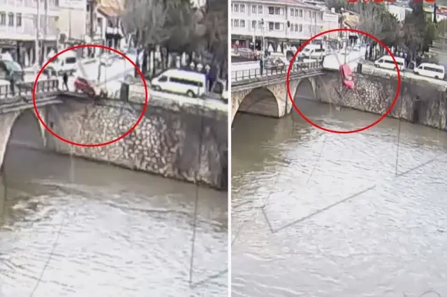 Kaza anı güvenlik kamerasına yansıdı. Görüntülerde, kavşakta 2 aracın çarpışması, otomobilin köprünün demir korkuluklarını kırarak nehre savrulması ve suda sürüklendiği anlar yer aldı.