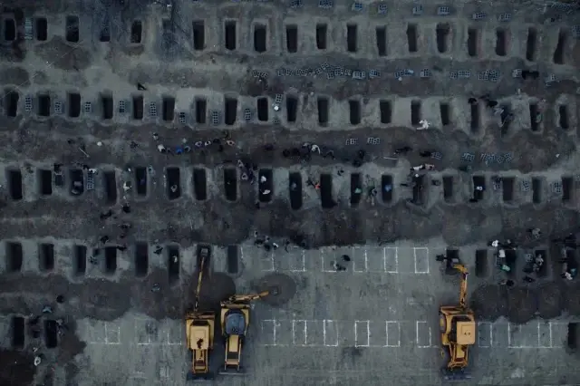Havadan kaydedilen fotoğraflarda, iş makinelerinin ve çok sayıda görevlinin defin işlemleri için yoğun mesai harcadığı görüldü. Yan yana açılan mezarlar, saldırının boyutunu tüm gerçekliği ile gözler önüne sererken, gören herkesi derinden etkiledi.