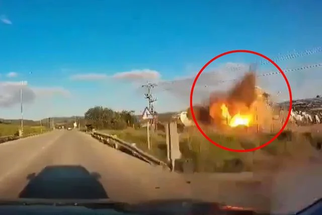 Hizbullah'ın dün düzenlediği saldırıda İsrail'in Beyt Şemeş kentinde bulunan uydu iletişim istasyonunu vurduğu anlar, yoldan geçen bir aracın kamerasına yansıdı.