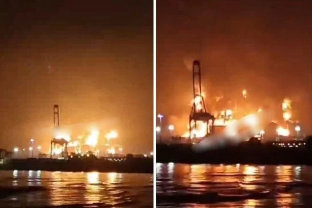 Saldırının ardından limanda büyük bir yangın çıktı. Büyük çaplı yangının sürdüğü bildirilirken; o anlar kameralara yansıdı.