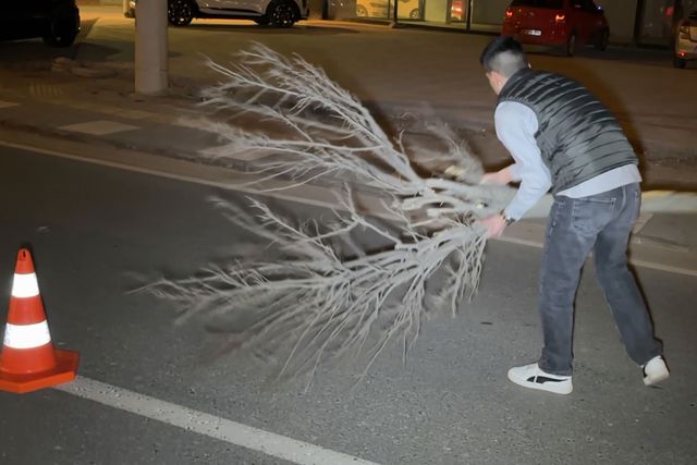 Öte yandan kaza nedeniyle cam ve plastik parçalarla dolu olan yolu, yoldan geçen ve eczacı olduğu öğrenilen Burak Yüksel isimli bir genç kırılan ağacı süpürge gibi kullanıp diğer araçların zarar görmemesi için temizledi. O anlar kameraya yansıdı.