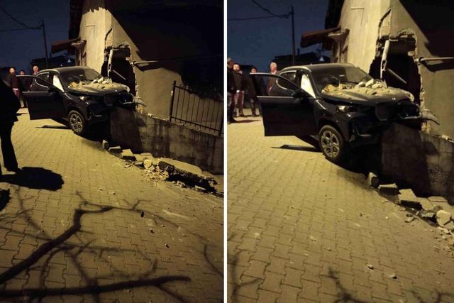 Yoldan çıkan lüks araç, yol kenarında bulunan bir evin istinat duvarına çarptı. Çarpmanın etkisiyle evin duvarı kısmi olarak yıkılırken, otomobilin ön kısmı yıkılan duvarda askıda kaldı.
