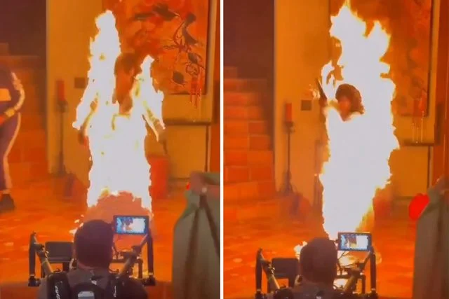 Senaryo gereği kullanılan alevlerin bir anda kontrolden çıkması üzerine ünlü yıldızın kıyafeti tutuştu. Set ekibi yangına söndürme tüpleriyle anında müdahale etti.