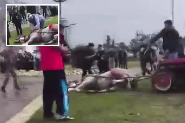 Çevredekilerin tepki gösterdiği kişi, arabaya bağlı olan atının iplerini çözmeye çalıştı. O anlar cep telefonu kamerasıyla görüntülendi.