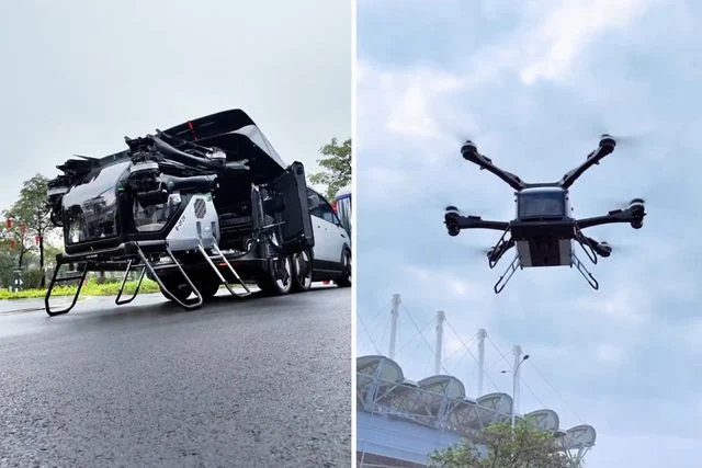 Çin, uçan araba için seri üretim sürecini başlattı. Hem karada hem de havada gidebilen bu fütüristik araç, altı tekerlekli dev bir taşıyıcı ve onun bagajından ayrılabilen iki kişilik elektrikli bir hava modülünden oluşuyor.