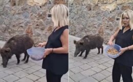 Safiye Soyman kapısına dayanan domuzu elleriyle besledi
