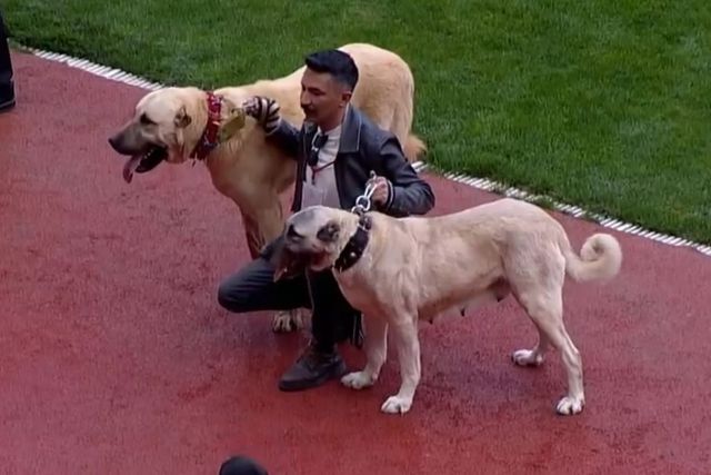 Karşılaşma öncesinde Sivas’ın simgelerinden olan kangal köpekleri sahaya çıkarıldı. Bu anlar tribünlerden ilgiyle takip edildi.
