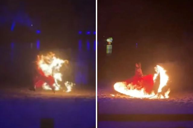 Çin'de gerçekleşen "ateş çemberi dansı" gösterisinde kadın sanatçı, kostümünün alev almasıyla insan meşalesine dönüştü. Şaşırtıcı olayda, dansçı suya atlayarak mucizevi bir şekilde yanmaktan kurtuldu.